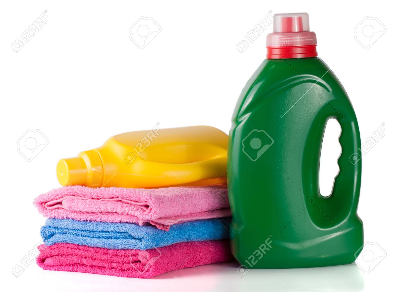 One Bottle Of Blue Fabric Softener Stack Of Towels Isolated Stock Photo Picture And Royalty Free Image Image 19066267