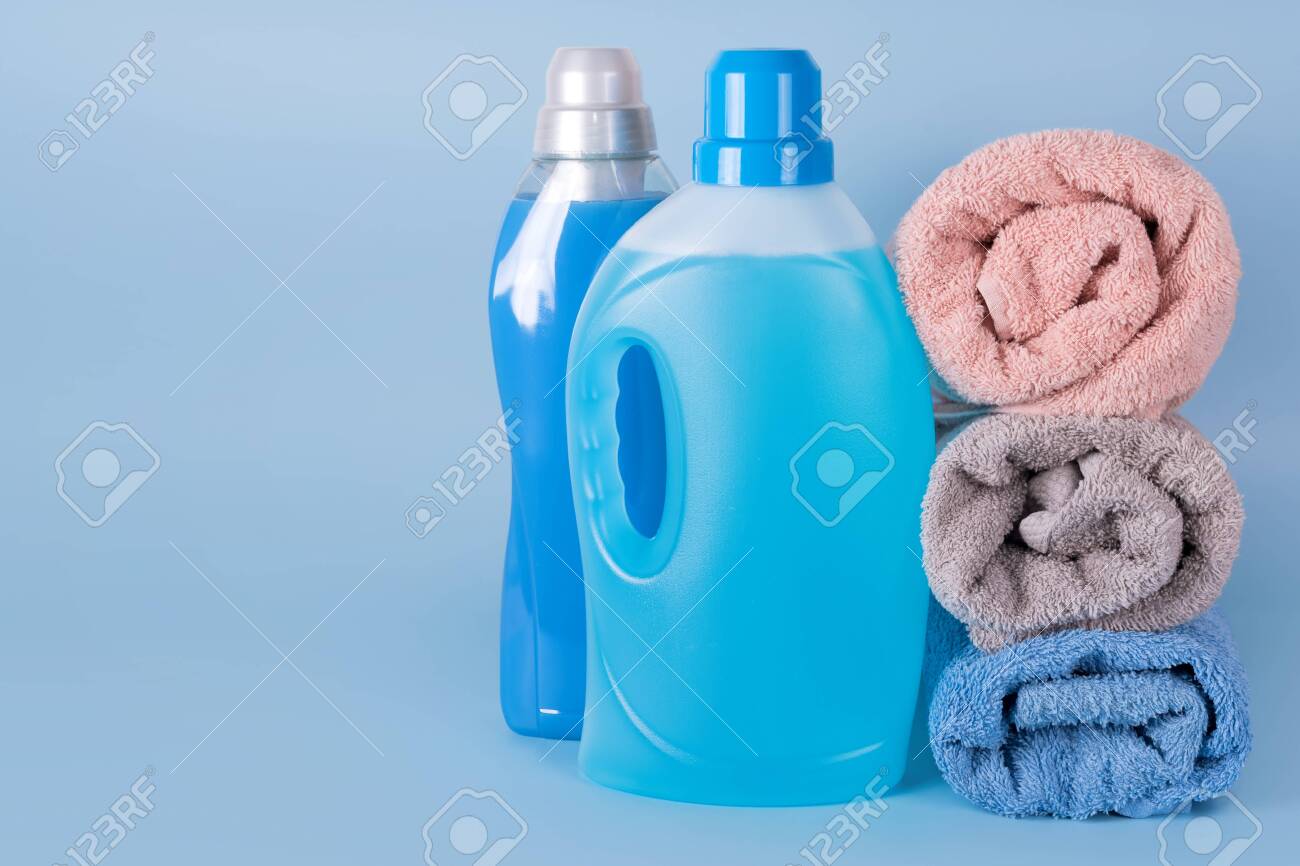 Bottles Of Detergent And Fabric Softener With Clean Towels On Stock Photo Picture And Royalty Free Image Image 150654881